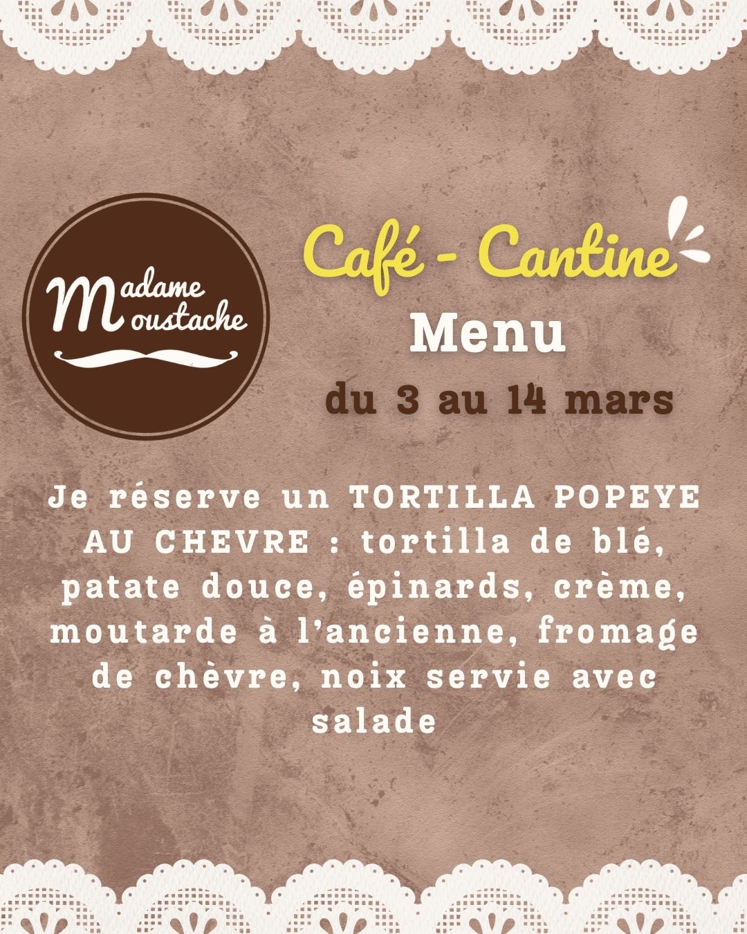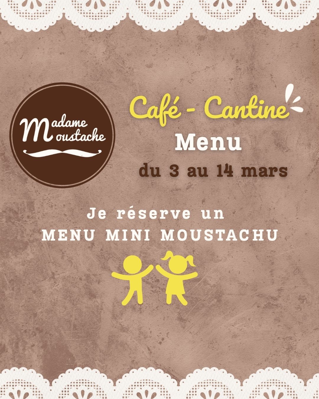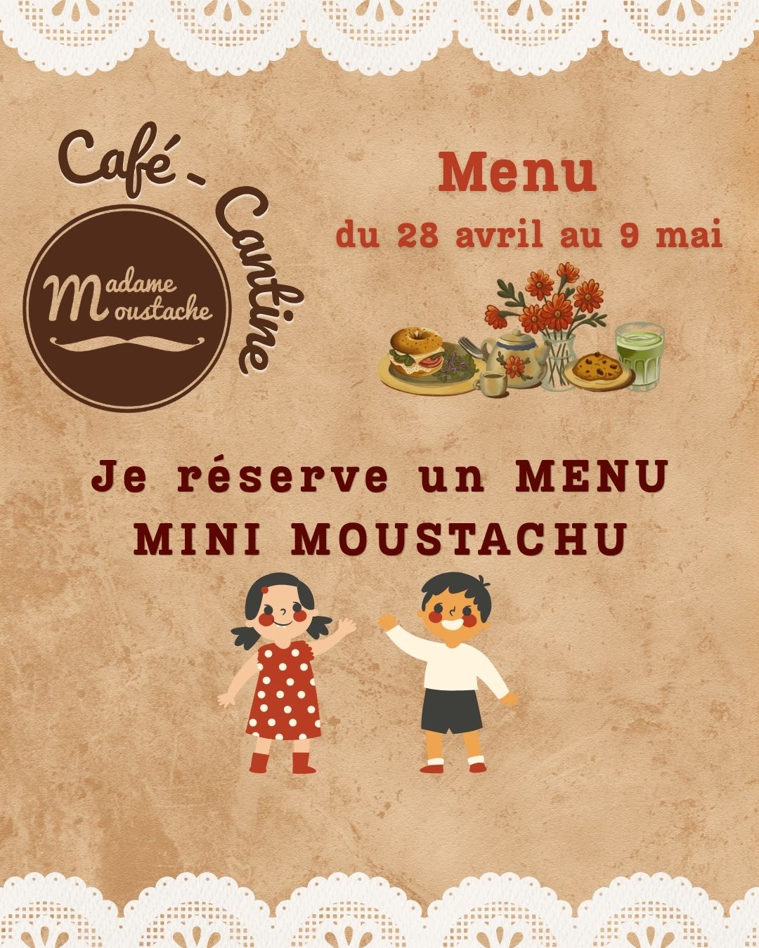 – Je réserve : 1 Déj des Minis Moustachus (Pain moelleux jambon emmental – Chips – Dessert au choix sur le comptoir à gâteaux – Sirop à l’eau) jusqu’à 12 ans