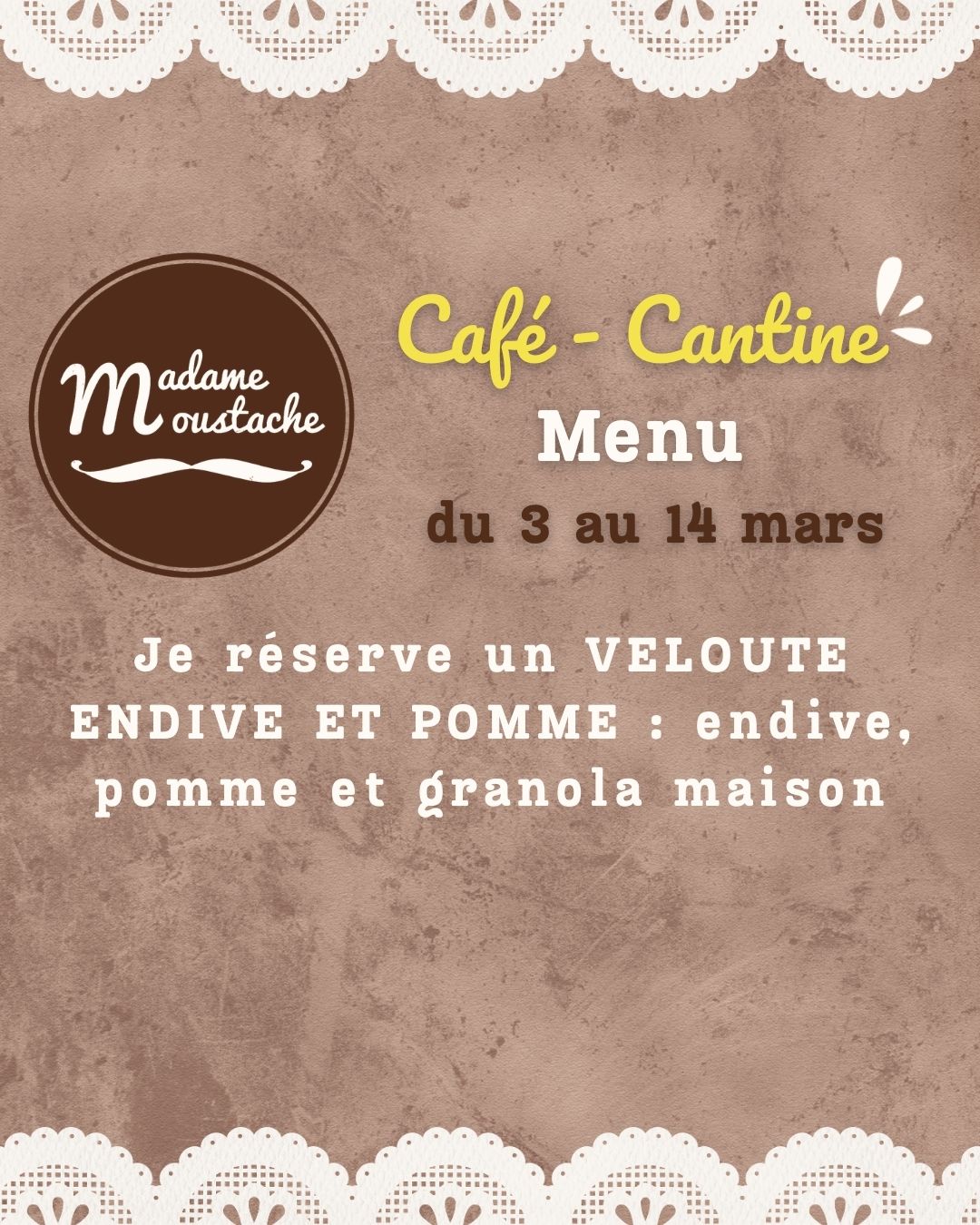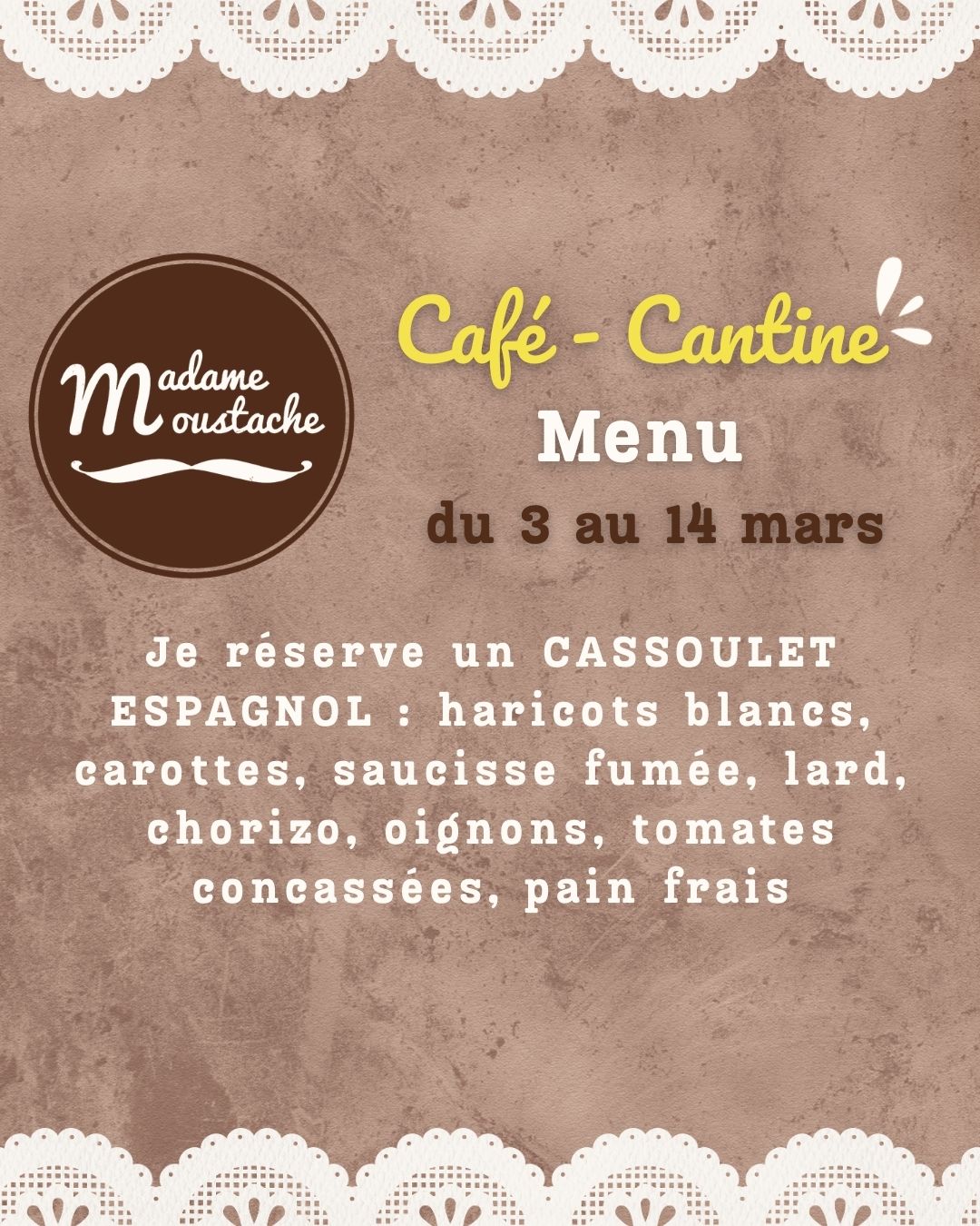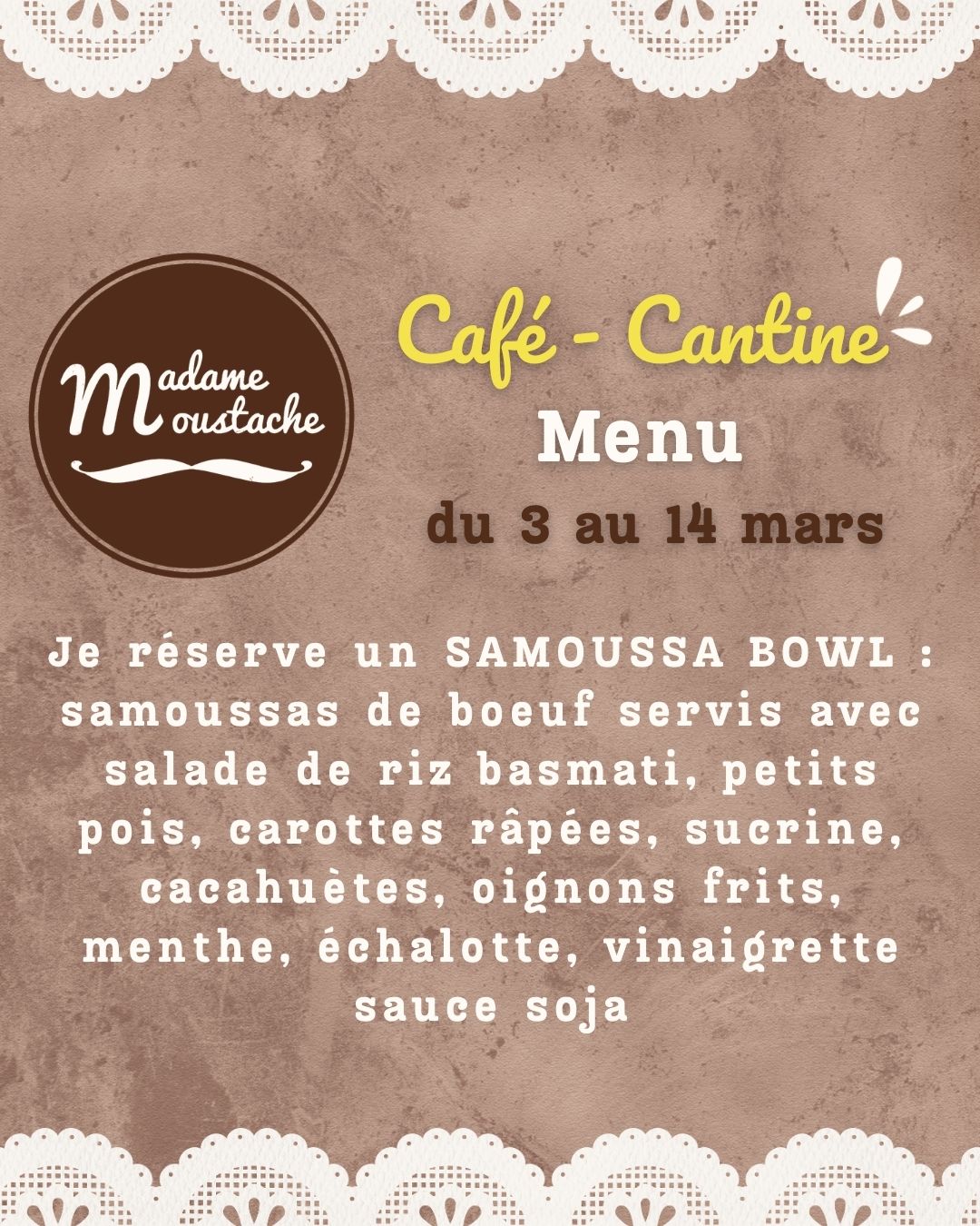– Je réserve : 1 Déj des Minis Moustachus (Pain moelleux jambon emmental – Chips – Dessert au choix sur le comptoir à gâteaux – Sirop à l’eau) jusqu’à 12 ans